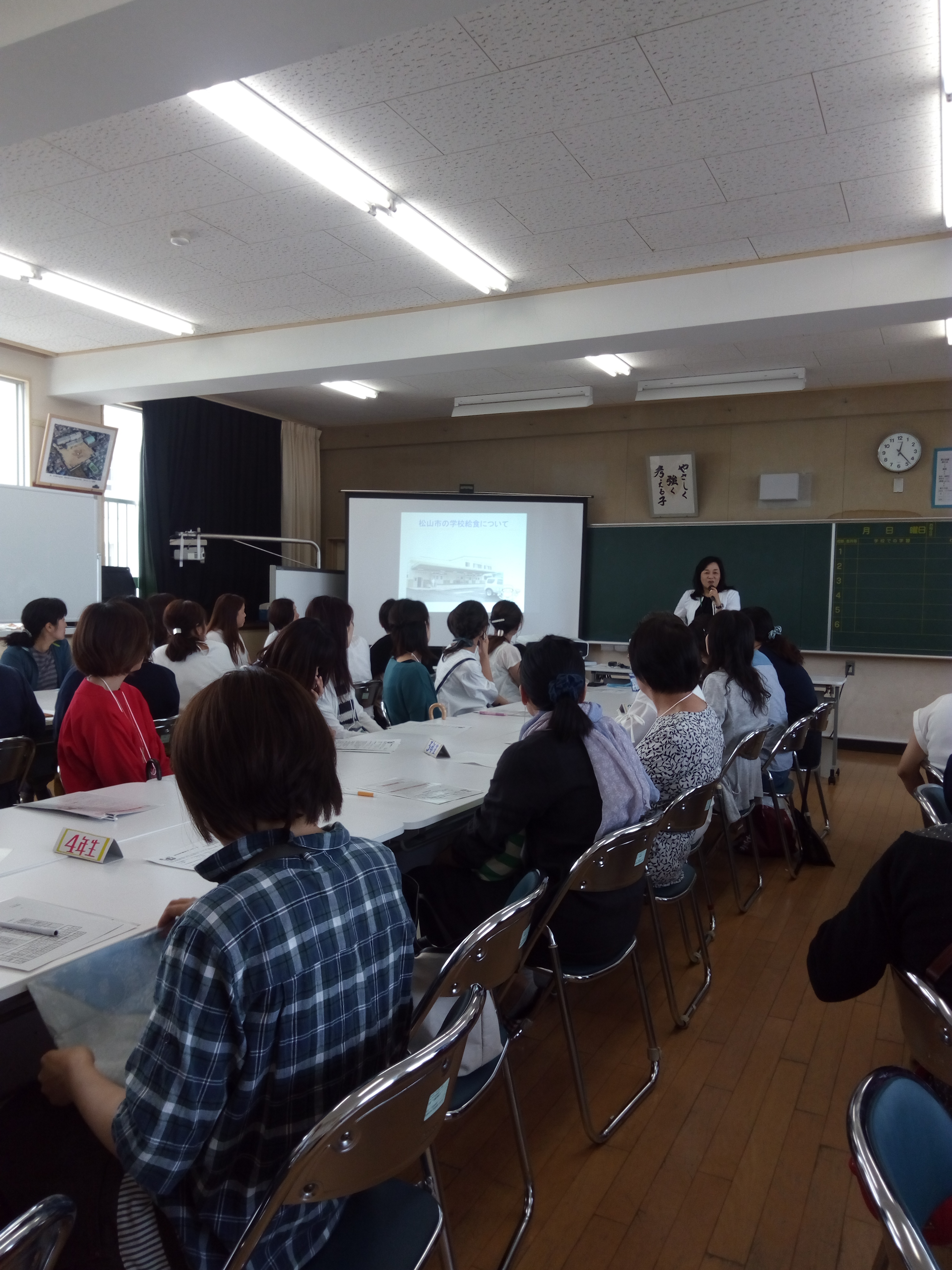 菅栄養教諭の話がありました。給食は、松山南共同調理場で作っています。市内の全小中が同じ献立を実施して、食材はできるだけ地産地消のものを選んでいるそうです。週単位で放射性物質の検査もしており、安全には十分気を配っているそうです。