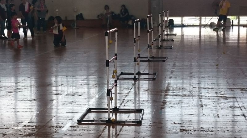 両端におもりのついた縄を定位置から投げ、はしご状の標的に引っかかれば得点になります。