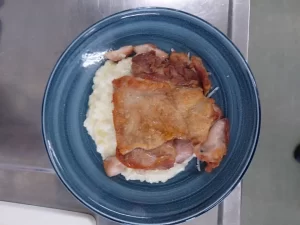 リゾットの上にチキンソテーをのせて盛り付けたら完成です!