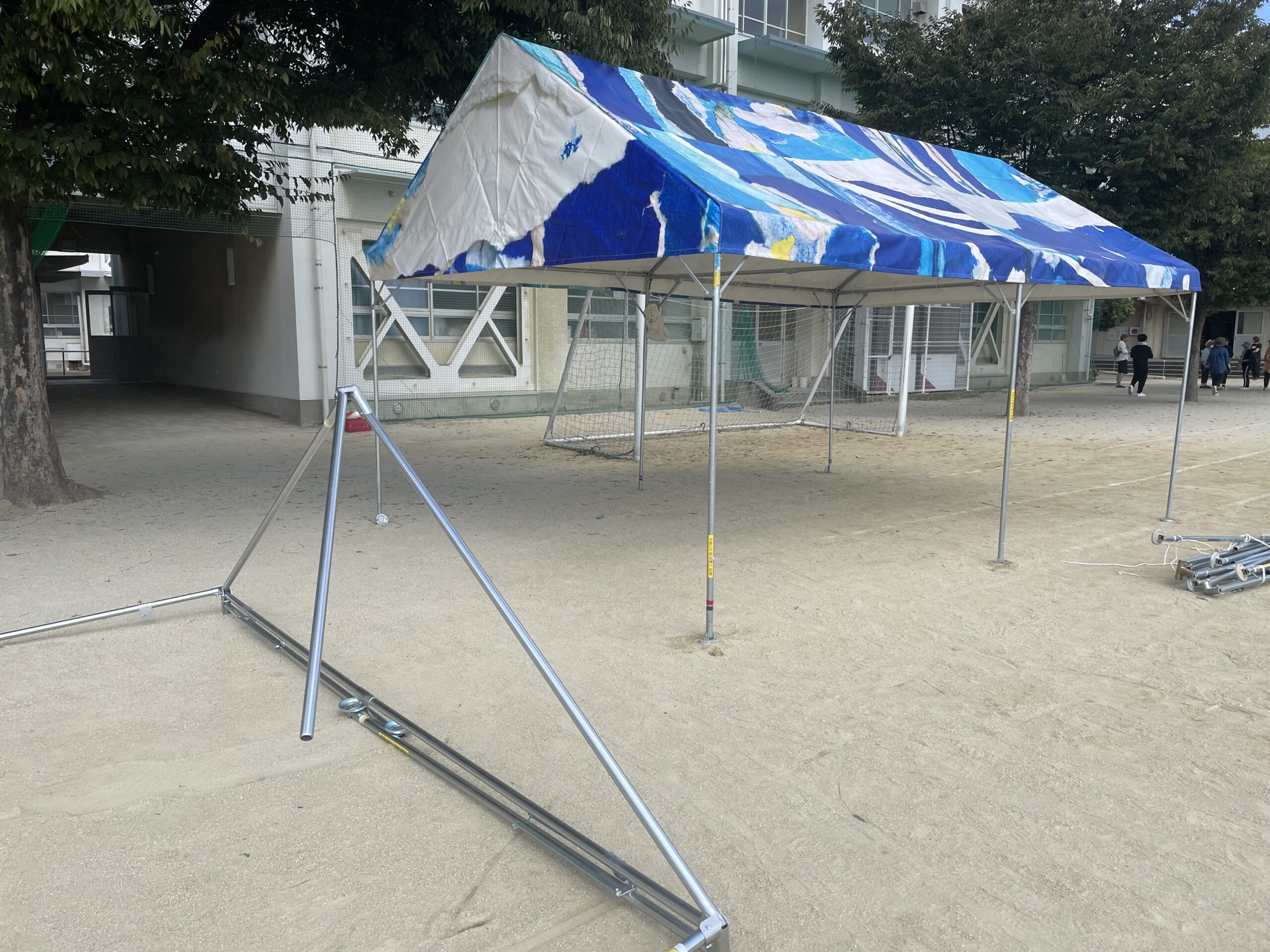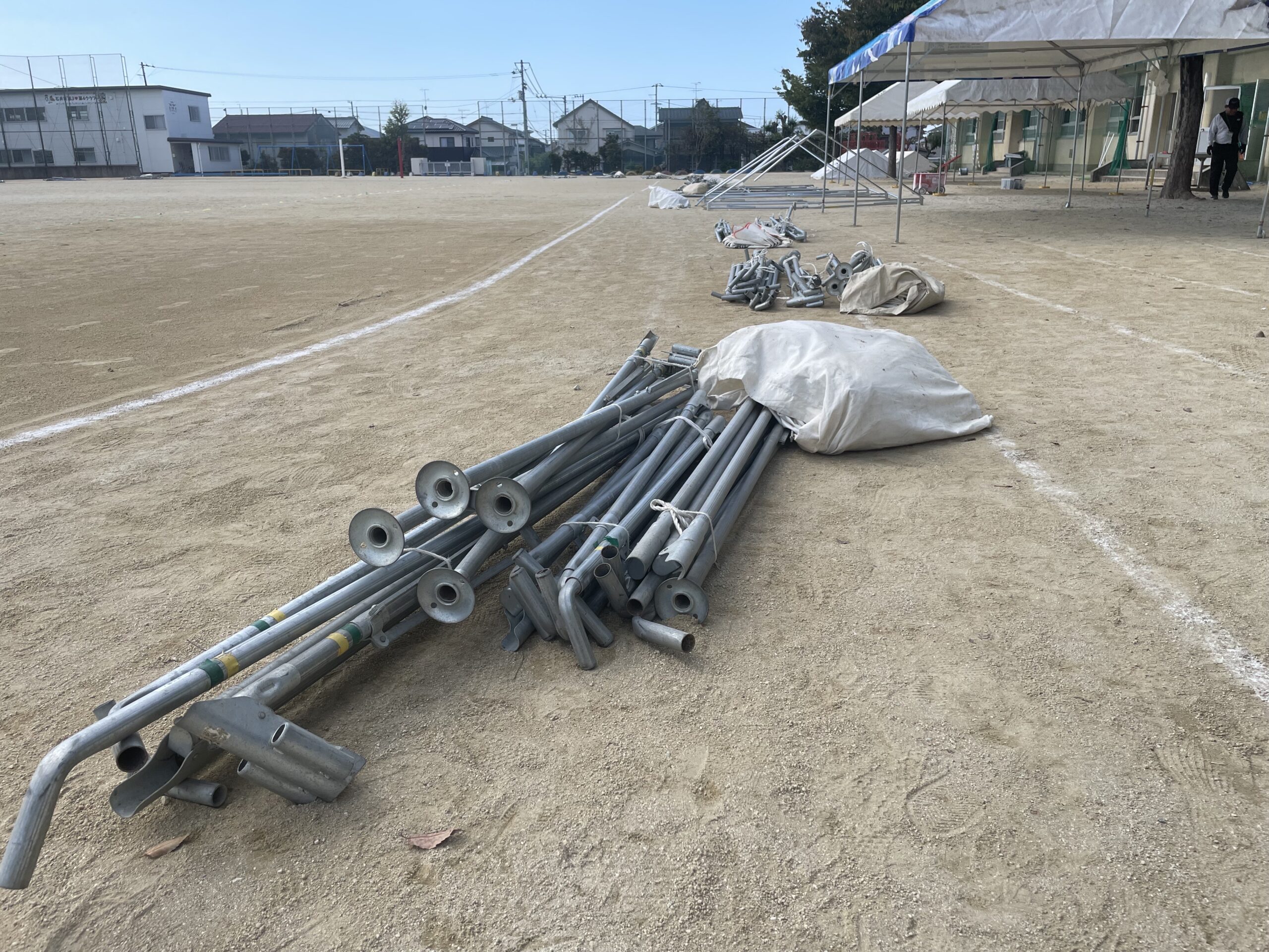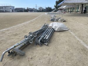 午前中に、おやじの会・PTA役員の皆さんが軽トラックで各テントの設置場所に支柱を置いてくださっていました。