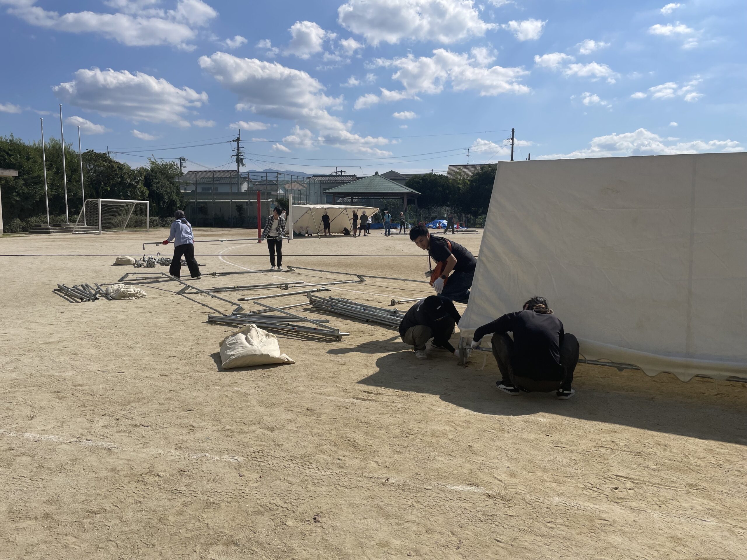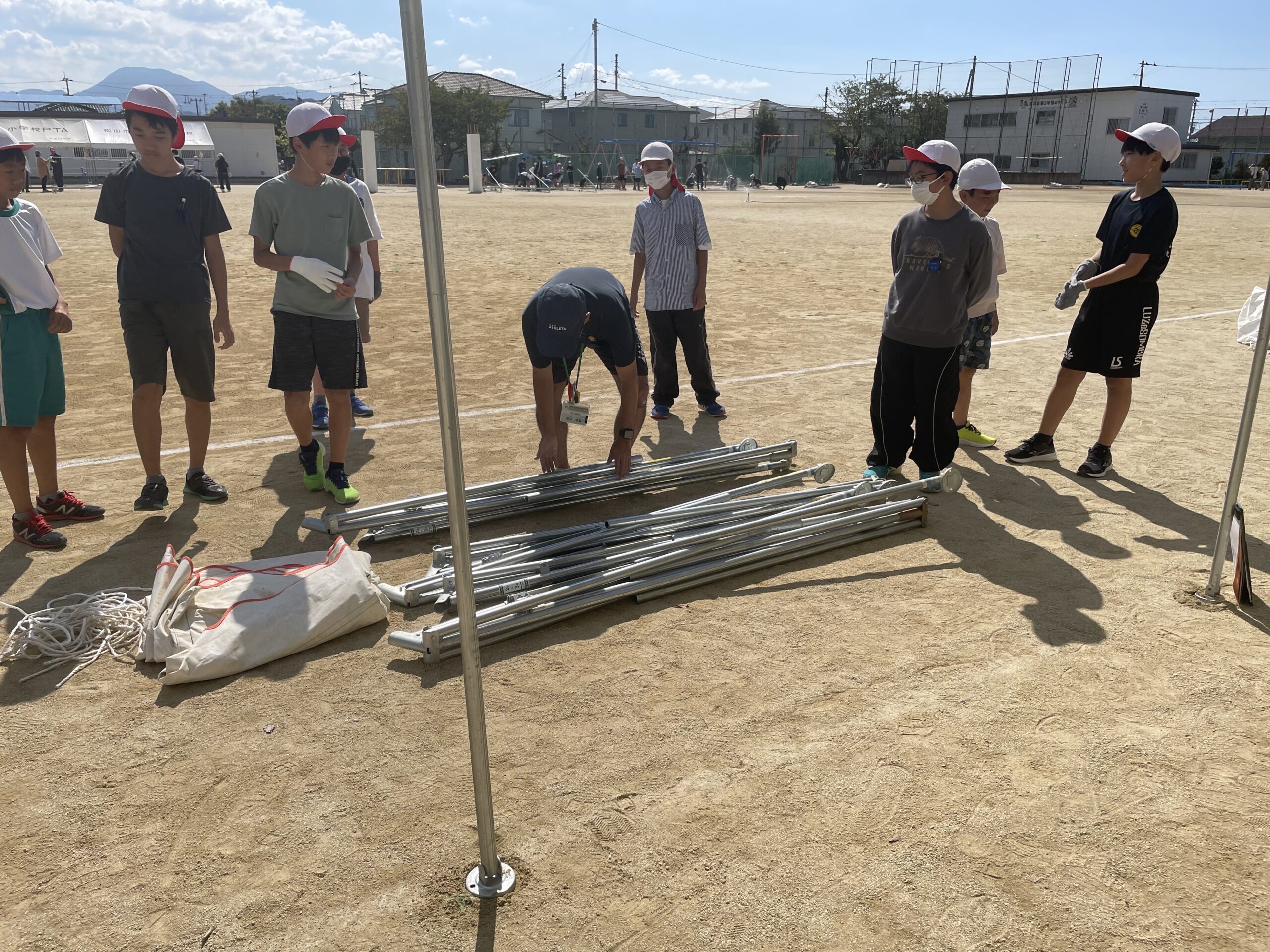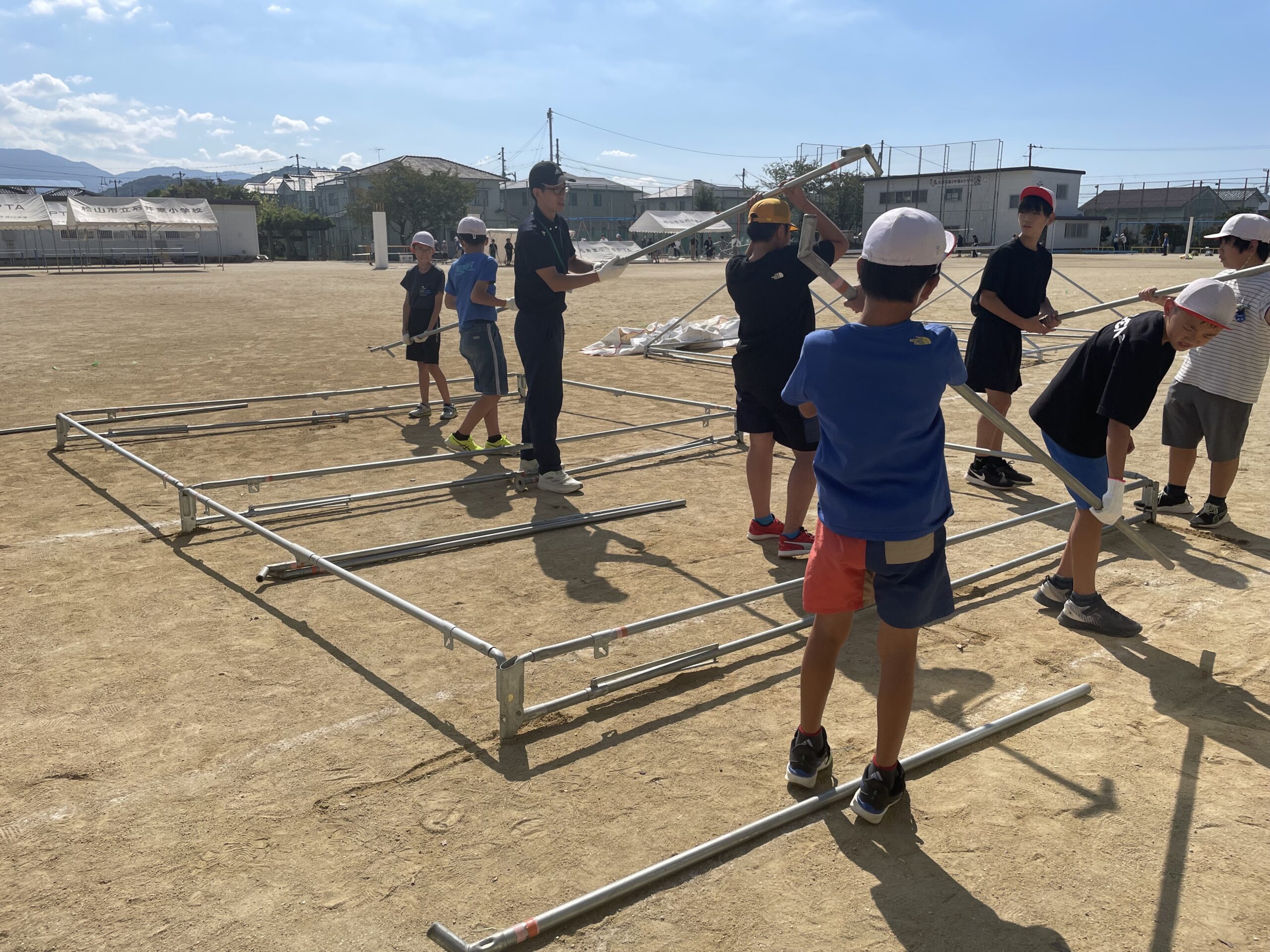 6年生・先生方と一緒に、おやじの会・各部の役員、本部の役員の方々のご協力のもと、テント設営開始です。