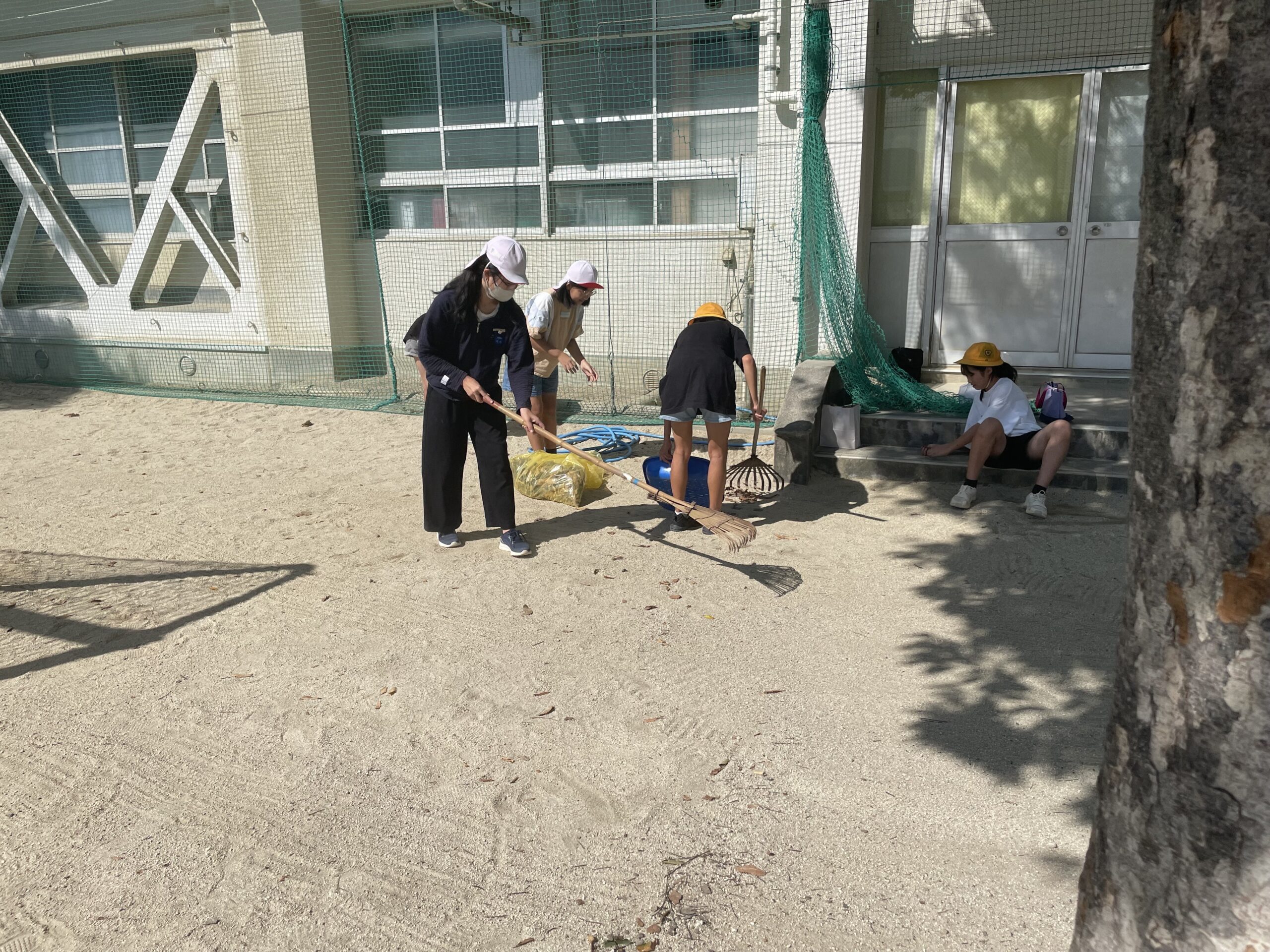 設営以外にも、運動場周りの落ち葉掃除やトイレ掃除など明日の運動会に向けて準備を行っていました。